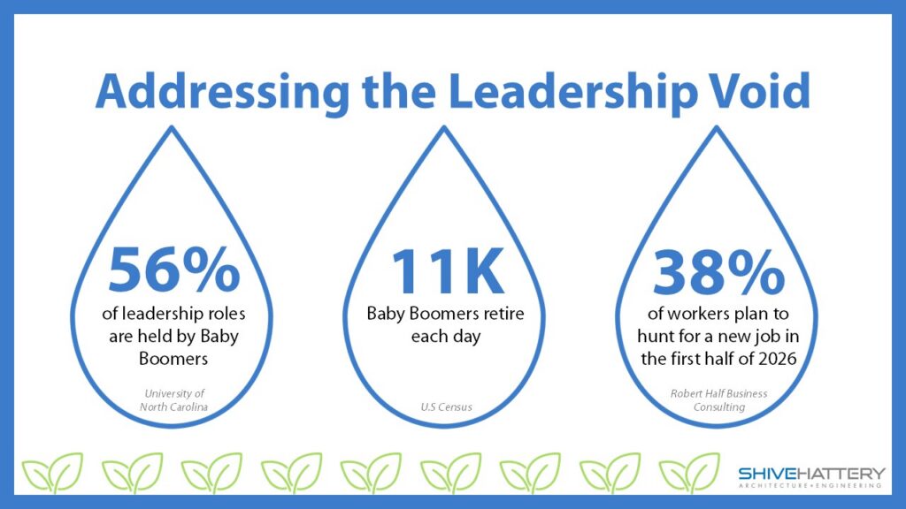 Across industries, leadership gaps are growing. More than half of leadership roles are held by Baby Boomers, thousands are retiring each day, and a significant portion of the workforce is considering job changes.