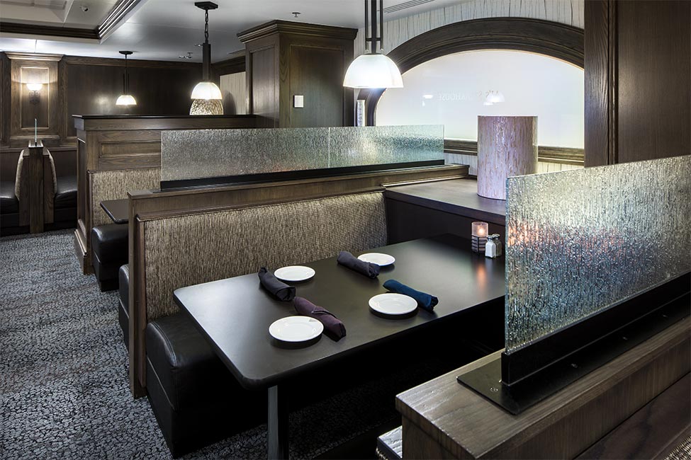 AJ’s Steakhouse – a bold new entry portal was created fronting the public concourse. Dark wood tones and a large glazed opening provide a distinctive presence. Finishes included a mix of black, off white, and charcoal gray colors along with textured glass accents. Glass tile and concealed LED lighting punctuate the ambiance. Space for an additional 44 occupants was provided by repurposing underutilized buffet area. This facilitated spacious hostess, waiting and bar areas while providing a link connecting both venues.
