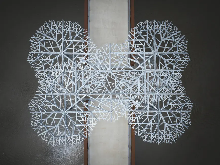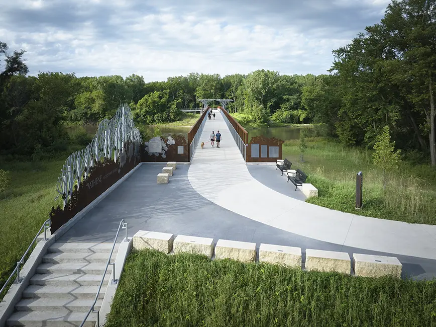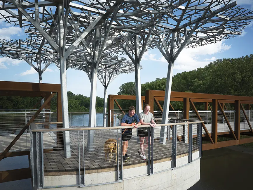 The project includes significant aesthetic enhancements centered on connecting to nature. Three key areas of the project highlight this theme. The first is a plaza on the north end, with limestone benches and a donor wall that uses different metals to evoke trees and leaves. In the middle of the pedestrian bridge, an iconic metal tree canopy that is visible from both sides of the river offers a shaded respite for travelers. The switch to modified ash wood flooring in this spot adds to the nature theme while being easy to maintain. Gateway features marking the Walnut Woods park entry carry the nature theme to the southern end of the trail.
