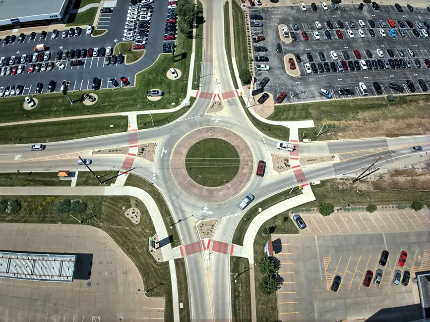 The City of Hiawatha, Iowa, had a safety problem on busy Boyson Road. Cars trying to turn left from the car dealerships, gas station and hospital near the I-380 interchange had to wait for a gap across two lanes of traffic; this was a challenging task that led to daring jumps into traffic or cars giving up and making a right turn then having to U-turn down the road. A traffic study showed that the safest and most efficient way to manage traffic would be to install a roundabout, which would keep traffic flowing but allow vehicles to safely enter Boyson Road from these side streets.