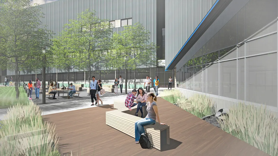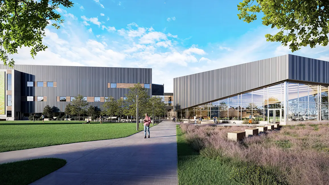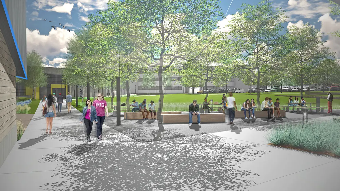 The new Student Life Building houses student support services, science classrooms and student areas. A remodel of the existing media center and academic achievement center at the adjacent Building 1, will create areas that encourage social interaction and support new technology. The campus will be reconfigured to promote a pedestrian-friendly environment, storm water management best management practices (BMPs), learning landscapes and exterior amenities.