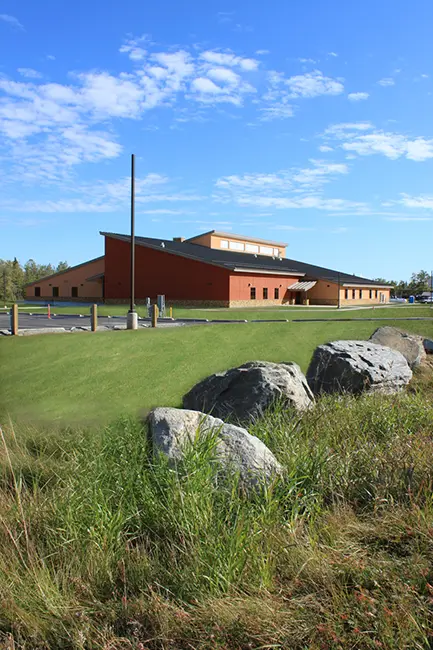 The design was created to ensure that the exterior would blend well with the Fort Greely architectural scheme. Distinctive massing and sloped roof forms and overhangs enhance the pre-engineered steel building structural frame, with exterior finishes of standing seam metal roofing, exterior insulation, and finish system and cast stone masonry.