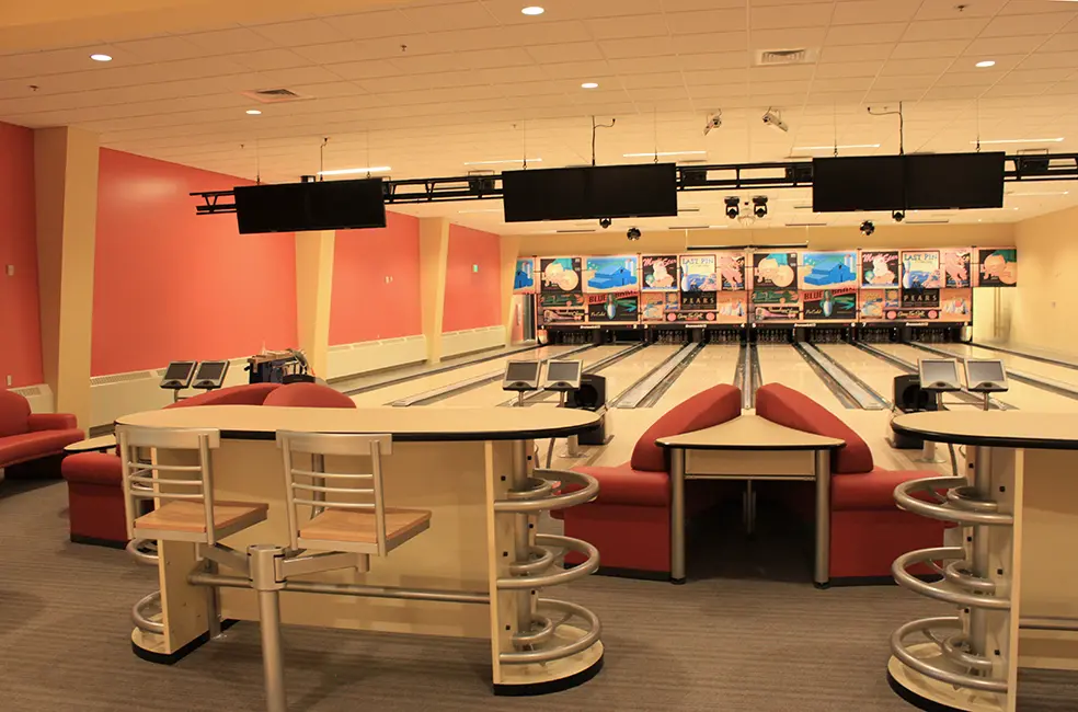 The central lobby and dining area feature a freestanding fireplace, high clerestory translucent panels, large window area at the entry and varied materials, colors, and lighting to create a congenial and spacious environment. The bowling center incorporates state-of-the-art construction and effects, and coordinated vibrant colors and furnishings. Windows provide views between the dining area and the bowling center.