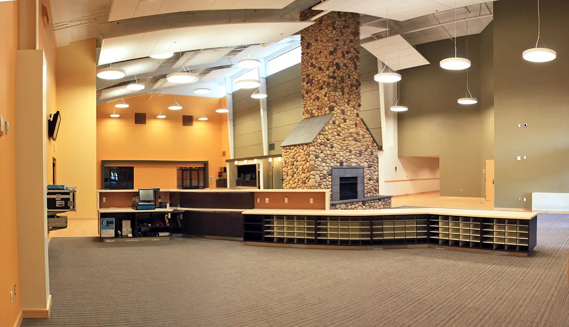 Shive-Hattery provided architectural and interior design services for this design-build project located on Fort Greely Army Base in Alaska. The 31,100 SF Community Activity Center includes eight bowling lanes, game and arcade rooms, commercial kitchen and bar, dining, multipurpose, and class/dance and study rooms. Design goals included providing a high-quality facility that was aesthetically appealing, functional, maintainable, and durable. The building needed to be a LEED Silver qualified facility with a superior exterior envelope for the Alaska environment. The final structure was tested at one-fifth of the air leakage permitted and saves an estimated 42% of the building’s annual energy costs over the baseline facility.