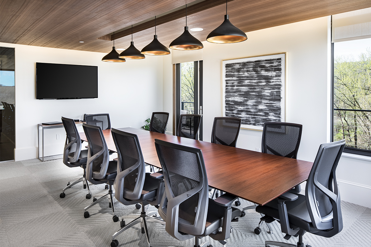 The team wanted an open work environment with lots of glass, but also needed closed offices to handle private matters. The solution: Glass-walled offices around the perimeter of the floor that allow daylight and wooded views to reach throughout the space, including the support staff’s open-area workspaces in the middle of the floor.