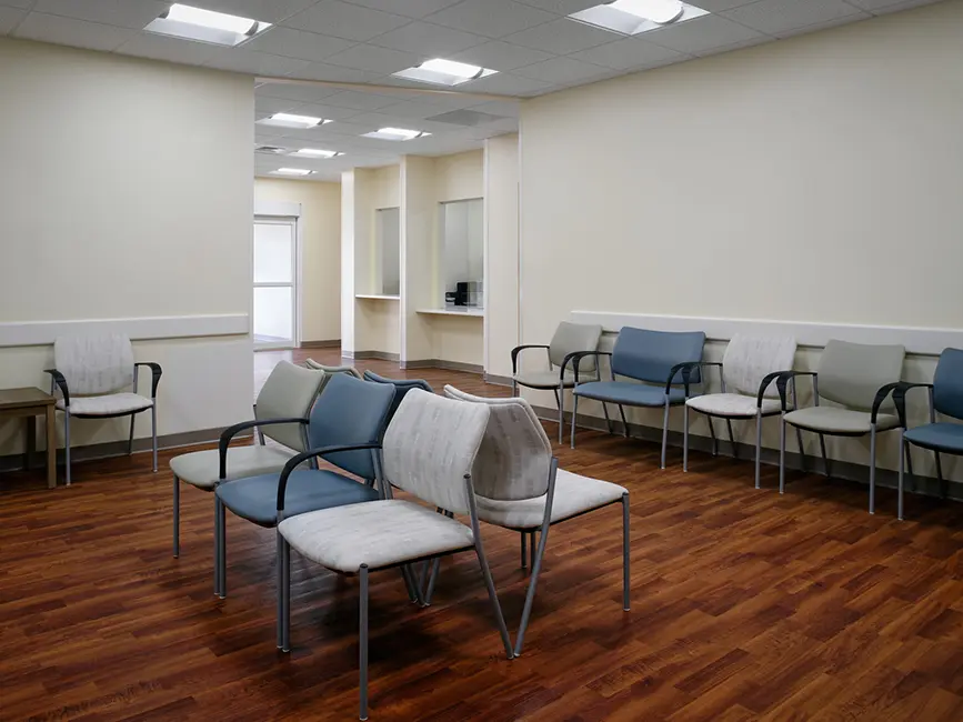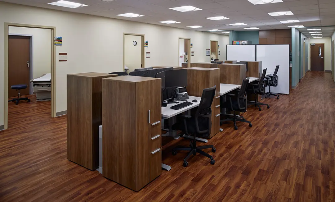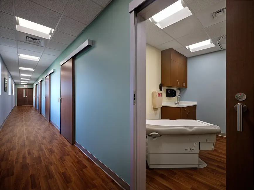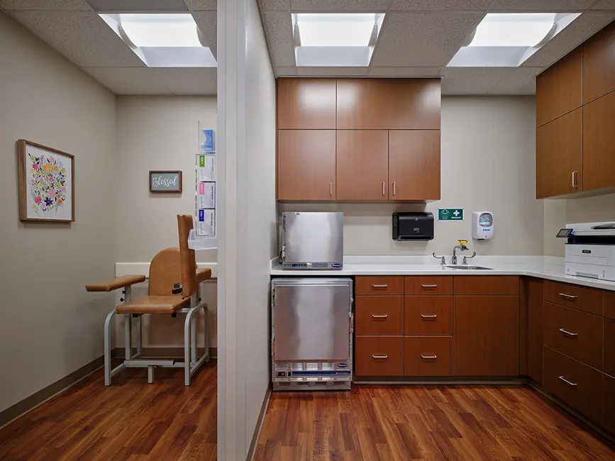 Inside, the clinic was carefully planned around the on-stage/off-stage care model. This layout separates public and staff pathways, enhancing patient privacy and operational efficiency. The facility includes a family medicine practice, pharmacy with drive-up service, general X-ray room, lab space, and a shared reception and waiting area. Extensive site development transformed the former recreational site into a fully functioning medical campus with ample parking.