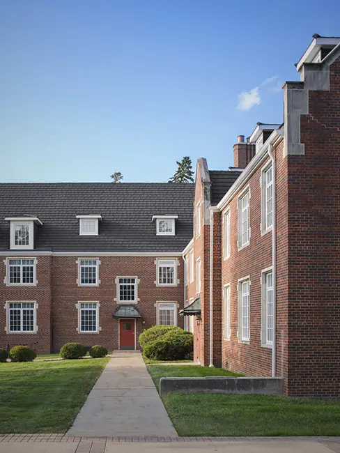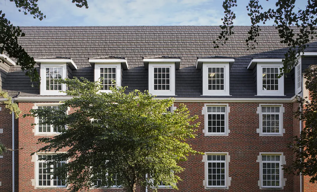 Shive‑Hattery partnered with the college to develop a roofing solution that balanced safety, longevity, and respect for place. Following careful asbestos abatement, the design team created a new roof assembly that restored the roof’s integrity and filled the gaps left behind without altering the building’s outward character. Material selection focused on finding a replacement that closely matched the scale, texture, and color of the original slate while delivering a service life of 50 years or more. Special attention was given to detailing at edges and transitions so the new roof would read as a natural extension of the building rather than a visible intervention.